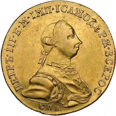 Описание аверса : В центре профильный портрет вправо императора Петра III. Вокруг портрета круговая надпись: «ПЕТРЪ•III•Б•М•IМП•IСАМОДЕРЖ•ВСЕРОС». Под портретом – буквы «С П Б», обозначение Санкт-Петербургского монетного двора. Описание реверса : В центре расположены, в виде креста, пять щитов с гербами. Центральный щит – изображение Герба Российской империи – двуглавый орёл со скипетром и державой. Верхний щит – Московский герб, нижний – герб царства Сибирского. Щит слева – герб царства Астраханского, справа – царства Казанского. Верхний щит венчает императорская корона, три других щита венчают царские короны.