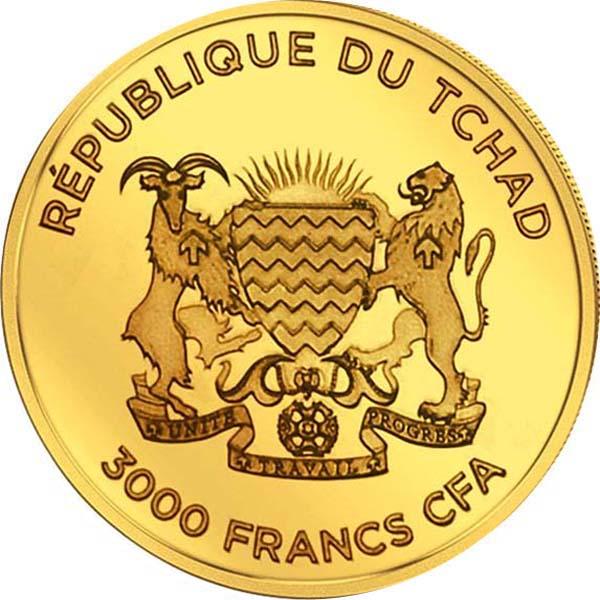 Покинув поверхность Луны, большинство лунных метеоритов оказывалось на околоземной орбите и в конечном счёте падало на поверхность Земли. Номинальная стоимость монеты – 3000 франков КФА, металл – золото 999-й пробы, качество чеканки – «пруф», вес – 0.50 гр., диаметр – 11 мм, тираж – 5 000 штук. На аверсе монеты изображён герб Республики Чад. В верхней части полукругом отчеканена надпись – «RÉPUBLIQUE DU TCHAD». В нижней части, также полукругом, указан номинал – «3000 FRANCS CFA». На реверсе, чуть правее центра, вставка из лунного метеорита. В нижней части реверса, слева, крупным планом изображена Луна. Вдоль канта отчеканено название монеты – «MOON METEORITE» и год эмиссии монеты – «2017». Каждая монета упакована в капсулу, которая закреплена в красочно оформленный буклет и имеет сертификат подлинности.