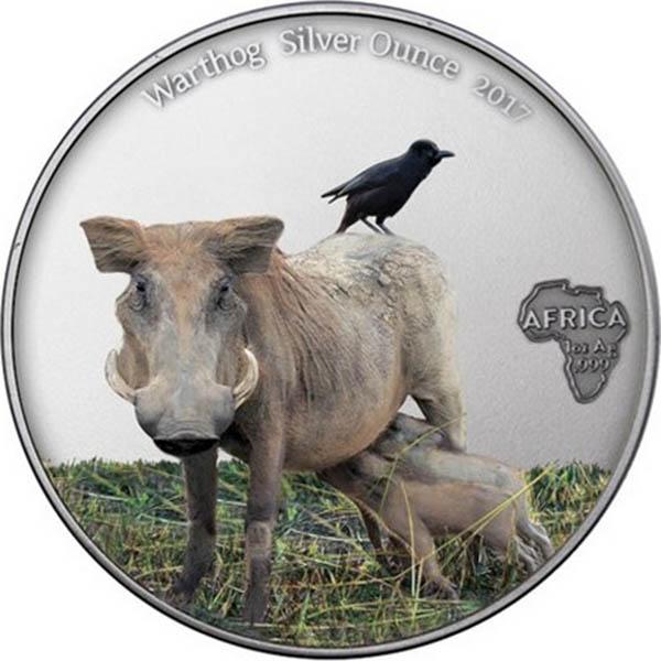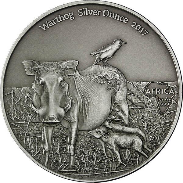 На затылке и на спине у бородавочника имеется грива. Хвост на кончике увенчан своеобразным утолщением. При опасности или побеге бородавочник имеет обыкновение поднимать его вверх, за что он в шутку получил кличку «Радио Африка». Взрослые самки бородавочника достигают веса до 70 кг, самцы до 100 кг; высота в холке достигает 65 см. Номинальная стоимость первой монеты – 1000 франков КФА, металл – серебро (999), качество чеканки «Antique Finish», вес – 31.13 гр., диаметр – 38.61 мм, тираж – 2000 штук. Номинальная стоимость второй монеты – 1000 франков КФА, металл – серебро (999), качество чеканки «Antique Finish», вес – 31.13 гр., диаметр – 38.61 мм, тираж – 500 штук. Тампопечать. Аверс для обеих монет одинаковый: в центре изображен герб Камеруна. Под ним указан номинал «1000 FRANCS CFA». В верхней части полукругом отчеканена надпись – «REPUBLIQUE DU CAMEROUN». На реверсе серебряной монеты изображена крупная самка африканского бородавочника с двумя детёнышами. В верхней части реверса полукругом отчеканены надписи – «WARTHOG», «SILVER OUNCE», «2017». Справа расположено изображение контура африканского континента. На нем написано – «AFRICA», а также указаны технические характеристики металла «1 oz Ag .999». С таким же дизайном, в количестве 500 штук были выпущены цветные монеты (тампопечать).
