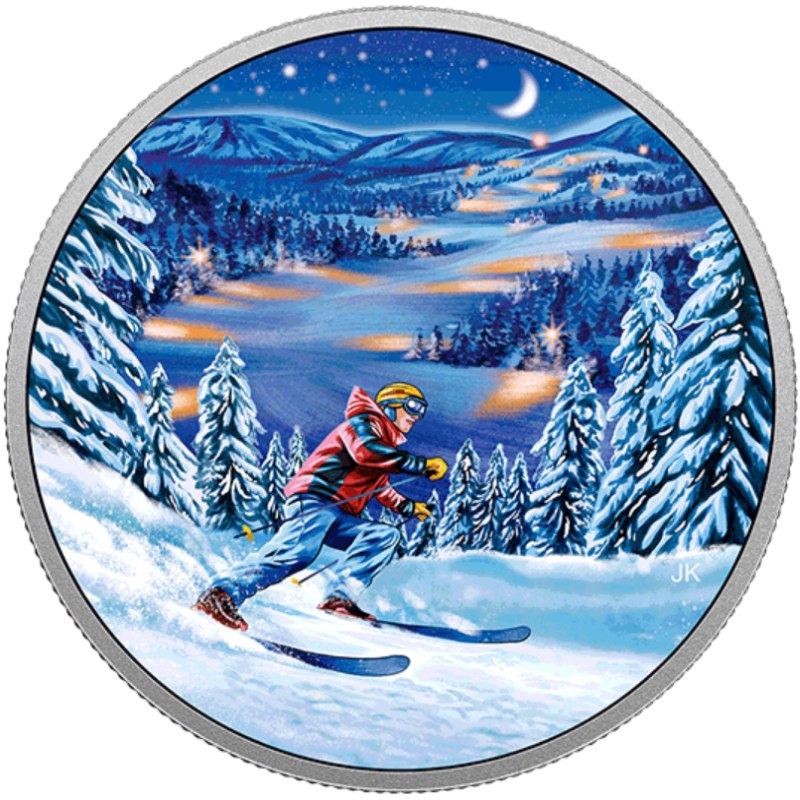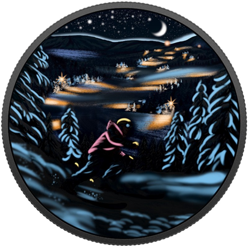 Королевский монетный двор Канады выпустил коллекционные монеты «Ночное катание с горы». Это первая монета новой нумизматической серии «Отдых в Канаде на открытом воздухе». При изготовлении Автор реверса – Joel Kimmel .На аверсе монеты «Ночное катание с горы» на фоне стилизованного поля изображен портрет королевы Великобритании Елизаветы II работы Сюзанны Блант (Susanna Blunt). Вдоль края монеты полукругом отчеканена легенда: «ELIZABETH II», «CANADA», «2017», «D • G • REGINA», «15 DOLLARS». На реверсе цветной монеты на переднем плане изображён лыжник, который на большой скорости спускается, вниз по склону горы, мимо заснеженных елей.