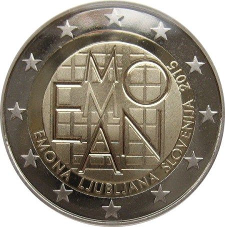 Поселение Эмона было основано в первые десятилетия I века н. э. на месте нынешней столицы страны Любляны. Лицевая сторона монеты – стандартная. На оборотной – отчеканена композиция, состоящая из букв, образующих слово Emona, и стилизованный план города. Объём чеканки монеты составит 1 млн. шт., в том числе 13,5 тыс. в качестве BU и 6,5 тыс. в качестве proof. Монета отчеканена на Словацком монетном двое в Кремнице. Большая часть монет поступит в обращение по номиналу. Монеты в качестве BU можно будет приобрести в составе годового набора евро Словении 2015 года (включает 8 монет регулярного чекана и 3 евро в честь первого текста на словенском языке, 13,5 тыс. шт.) по цене €25 или такой же набор в качестве proof за €45 (1,5 тыс. шт.). Отдельно памятная монета номиналом 2 евро в качестве proof будет стоит €9 (5 тыс. шт.).