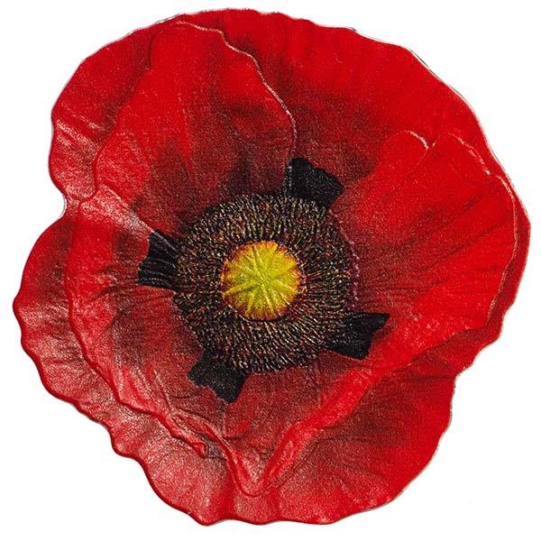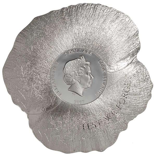 Компания Coin Invest Trust представила коллекционные вогнутые монеты «Красный мак», посвященные символу памяти жертв всех вооруженных конфликтов. Номинальная стоимость монеты – 5 новозеландских долларов. Драгоценный металл – серебро 999-й пробы, качество – «пруф-лайк», вес – 3.1 гр., диаметр – 45 мм, лимит чеканки – 2 500 шт. На выпуклом аверсе серебряной монеты изображён портрет Ее Величества королевы Великобритании Елизаветы II работы Иена Рэнк-Бродли (Ian Rank-Broadley FRBS). По кругу аверса находится легенда: «ELIZABETH II», «COOK ISLANDS», «5 DOLLARS».